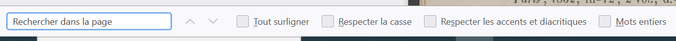 Selon la visionneuse utilisée par votre navigateur, la fenêtre de recherche se trouvera généralement soit en haut et à droite soit en bas et à gauche de votre écran. Elle vous permettra de retrouver le mot ou groupe de mots souhaités et dans certains cas vous pourrez affiner votre recherche en cochant ou non des cases : surlignage de toutes les occurences (résultats de recherche), respect de la casse (majuscules/minuscules), respect des accents et des diacritiques (points, accents, tréma, cédilles), recherche exclusive de mots entiers.